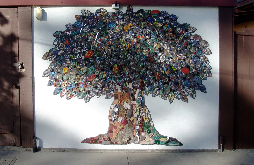 The tree’s leaves were created by all ages, using bits and pieces of broken ceramics, jewelry, glass, stone, precious personal and significant items, including fragments of the Berlin Wall, pieces from Auschwitz, a beloved dog’s license tag, a father’s watch face, pieces of great grandmother’s china, a key to the front door of a loved home and so much more.