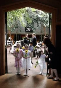 Located just outside the Sanctuary, the tree-shaded Atrium is suitable for dancing and/or a light meal. It opens out onto the Terrace, offering a spectacular view of the Bay and Golden Gate Bridge. If desired, the Social Hall and professional kitchen can provide all that is required for a formal catered sit-down dinner accompanying your wedding. If you prefer a smaller celebration, the Fireside Room provides a warm, intimate environment and has a baby grand piano.