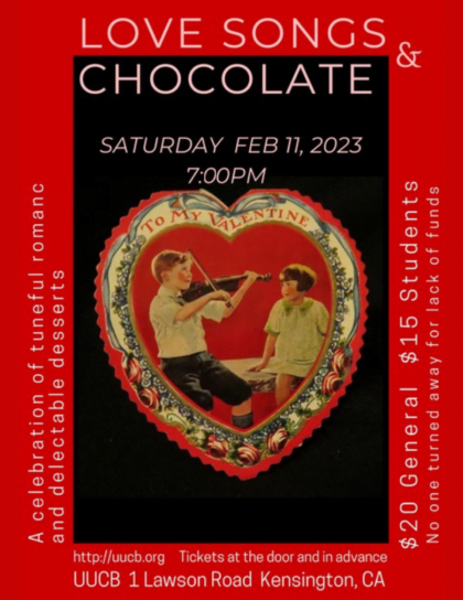 Please join us for Love Songs and Chocolate, a celebration of tuneful romance and delectable desserts. In a relaxed, cabaret-like setting, many singers from our community share beguiling love songs from the classics to Broadway to jazz.